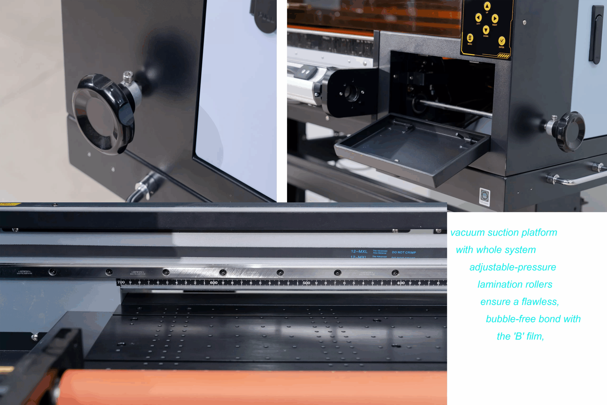 The system features a 4-zone adjustable vacuum suction platform to keep the ‘A’ film perfectly flat. Crucially, the adjustable-pressure lamination rollers ensure a flawless, bubble-free bond with the ‘B’ film, which is essential for consistent, high-quality transfers.