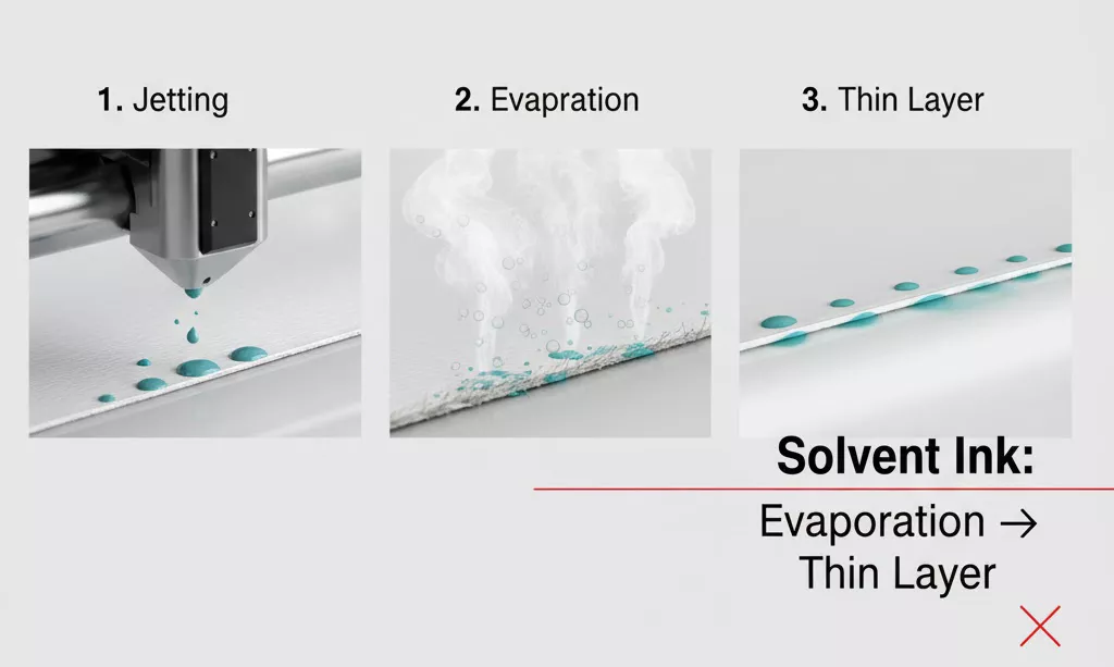 Drying Process: Relies on evaporation. After jetting, the volatile solvent evaporates into the air, leaving only a thin pigment film on the substrate.