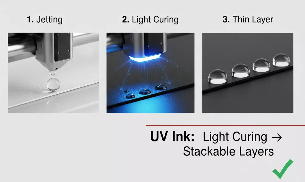 The Critical Limitation: Evaporation makes layering impossible. Applying a second layer before the first fully dries creates a messy, uncured pool of ink that fails to adhere—ruining the print Solvent printing is inherently a single, flat-layer process, so “thik layer” or braille is technically unachievable. This is why “texintel epson printer uv solvent thik layer braille” can never lead to a solvent-based solution.