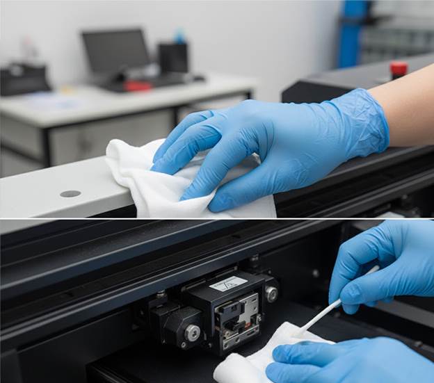 At the end of the day, gently wipe the printhead surface with a non-woven cloth to remove any stray ink fibers or dust .