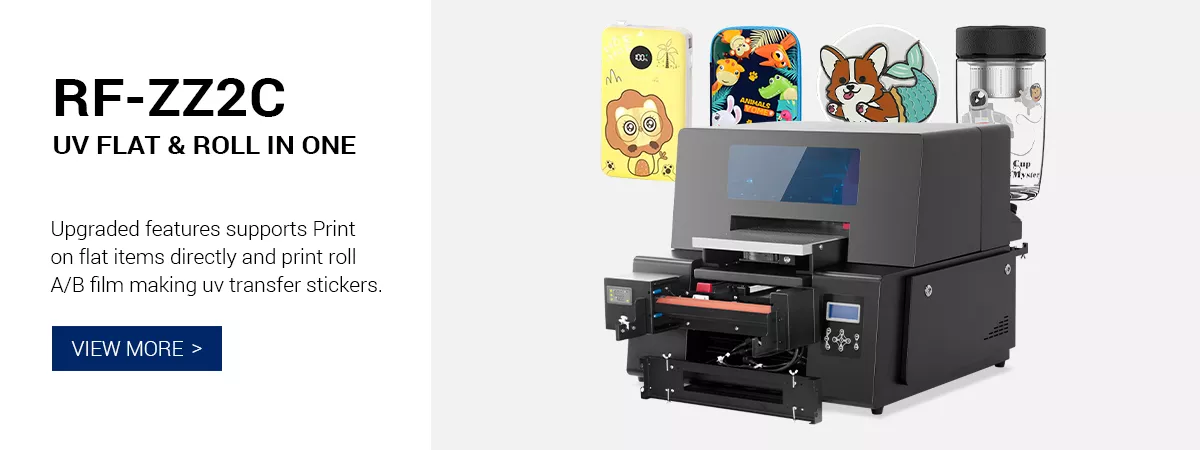 In this Exhibition, you will find a Multifunctional UV Flatbed & Roll in one Printer, which is RF-ZZ2C Upgraded model; As UV Flatbed Printer, it can print on any flat items directly, like phone cases, wood, acrylic, metal, pvc, golf ball, pens, even tumblers; As the UV DTF Printer, it prints on Roll A Film and laminating B film to make uv transfer stickers.
