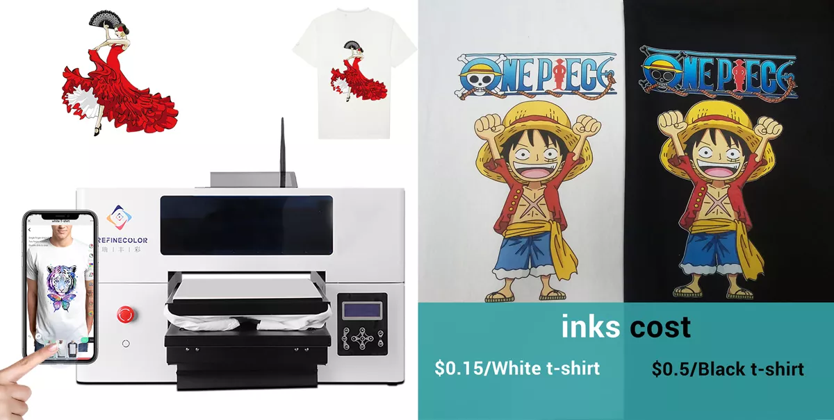 Also, we supply DTG Printer(Direct To Garment Printer), it’s A3 size DTG T-shirt printer, mainly for cotton t-shirts, White and colored available to print, printed image is super soft and comfortable.